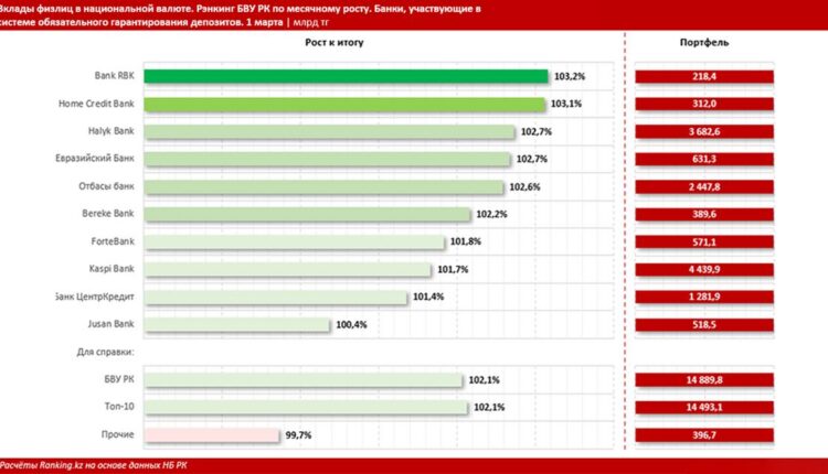 Bank RBK стал лидером среди топовых БВУ в секторе по месячному росту вкладов физических лиц в нацвалюте: по итогам февраля текущего года плюс 3,2%, до 218,4 млрд тенге. В годовой динамике финансового института также отмечается уверенный рост: портфель тенговых депозитов Bank RBK увеличился на треть (плюс 33,2%).