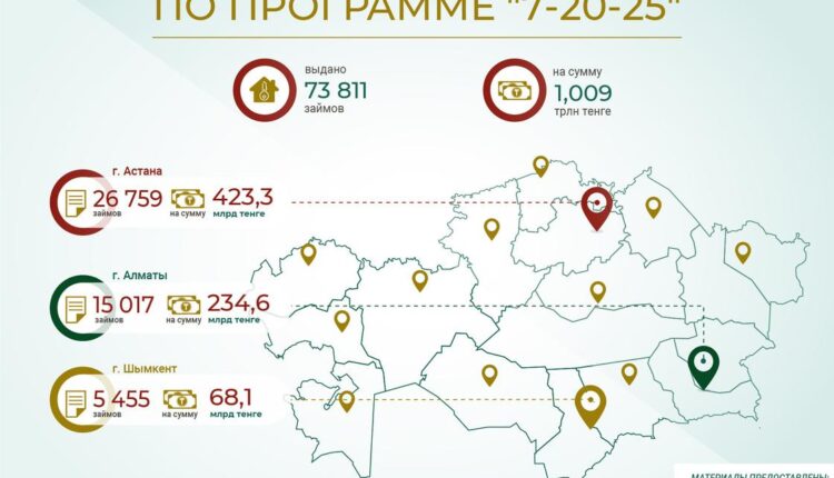 Больше всего денег было освоено в Астане – 26 759 займов на 423,3 млрд тенге. Следом идет Алматы – 15 017 займов на 234,6 млрд тенге. В Шымкенте было выдано 5 455 займов на 68,1 млрд тенге, а оставшаяся сумма была распределена между остальными регионами Казахстана.