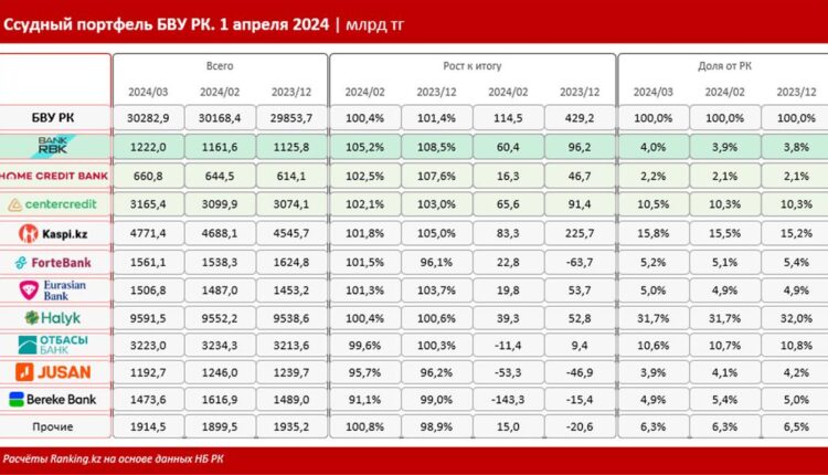 К апрелю текущего года совокупный ссудный портфель БВУ РК достиг 30,3 трлн тг — на 0,4% больше, чем месяцем ранее. С начала года показатель вырос на 1,4%. Среди крупнейших и самых значимых БВУ РК лидирует с заметным отрывом Bank RBK — месячный рост ссудного портфеля финансового института составил сразу 5,2%, до 1,2 трлн тг. В динамике с начала года банк также в лидерах — плюс 8,5%. При этом качество ссудного портфеля у Bank RBK было и остается отличным: доля NPL 90+ составляет здесь всего 2,5%, сообщает Ranking.kz.